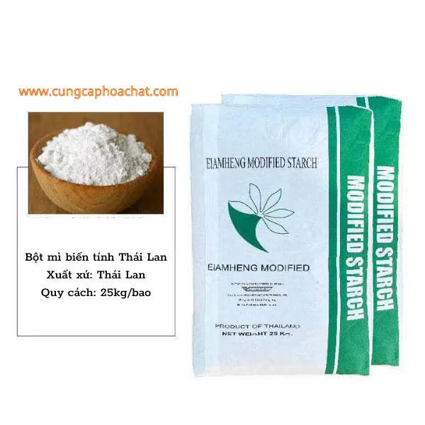 Công Ty TNHH XUẤT NHẬP KHẨU DỊCH VỤ LINH ĐAN cung cấp, mua bán sản phẩm bột mì biến tính Modified Starch Thái Lan (25kg/bao) là tinh bột tự nhiên đã được thay đổi tính chất, cấu trúc bên trong nó bằng cách điều chế từ các phương pháp Vật lý, Enzyme hoặc Hóa học. Tinh bột mì biến tính hỗ trợ làm tăng khả năng giữ nước, chống khô nhớt sản phẩm, được dùng làm phụ gia cho công nghiệp bánh kẹo, đồ hộp, trong công nghiệp mỹ phẩm và dược phẩm dùng làm phấn tẩy trắng.
